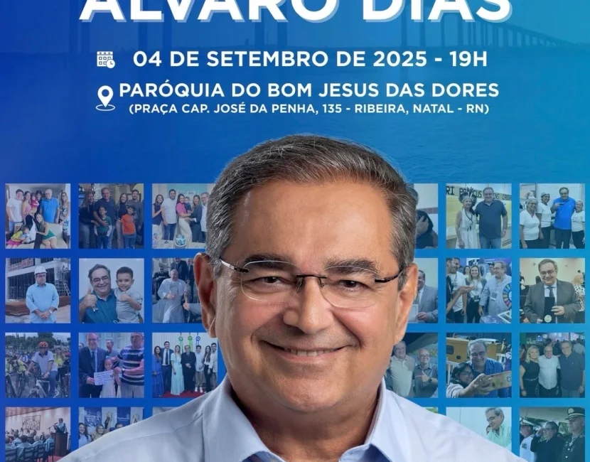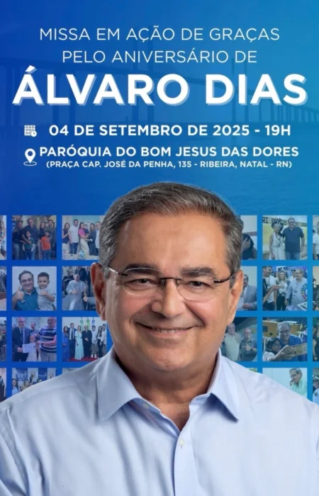 O ex-prefeito de Natal, Álvaro Dias (Republicanos), reúne amigos, familiares e correligionários nesta quinta-feira (4) para celebrar seu aniversário com uma Missa em Ação de Graças, que será realizada às 19h, na Igreja Bom Jesus, no bairro da Ribeira.